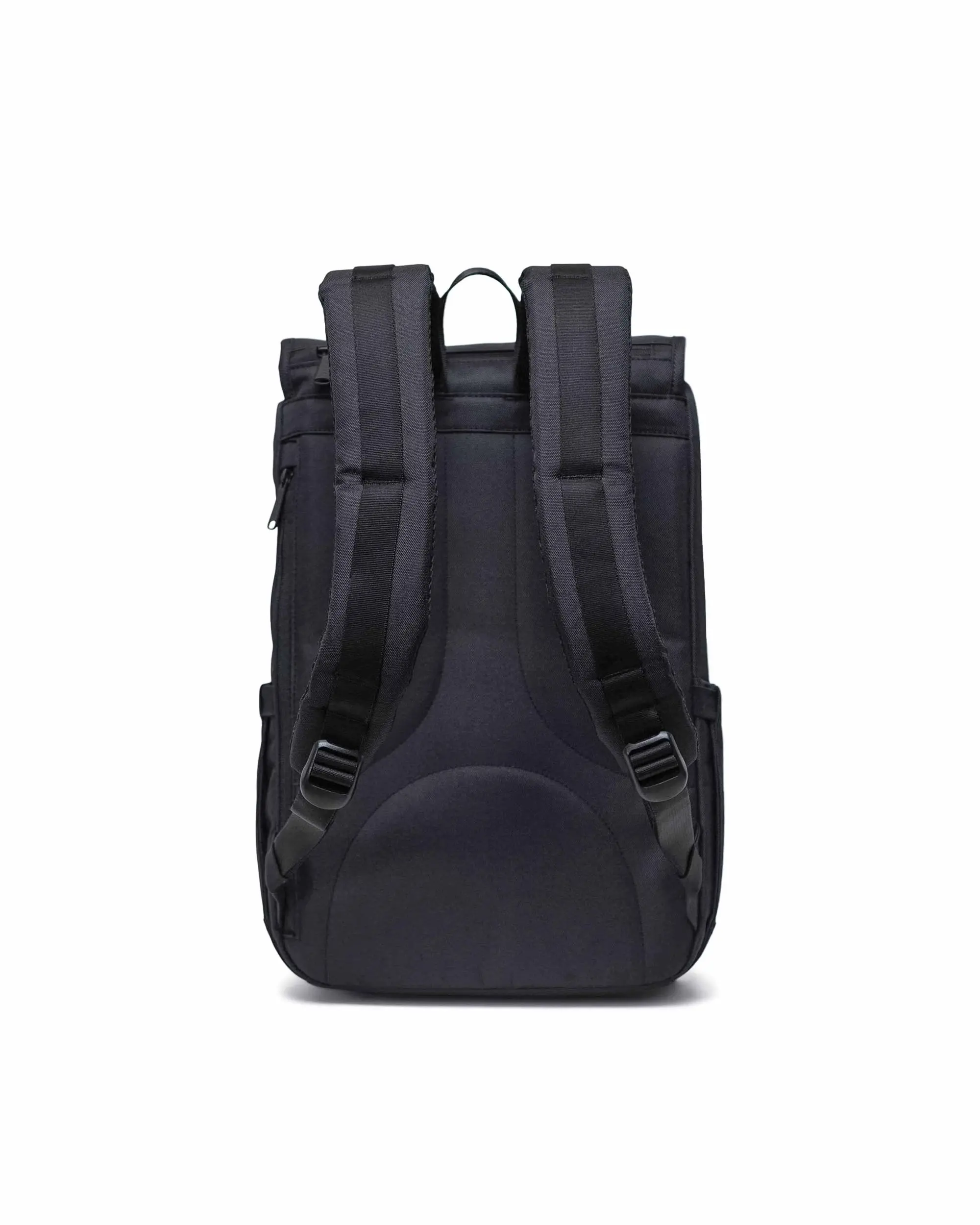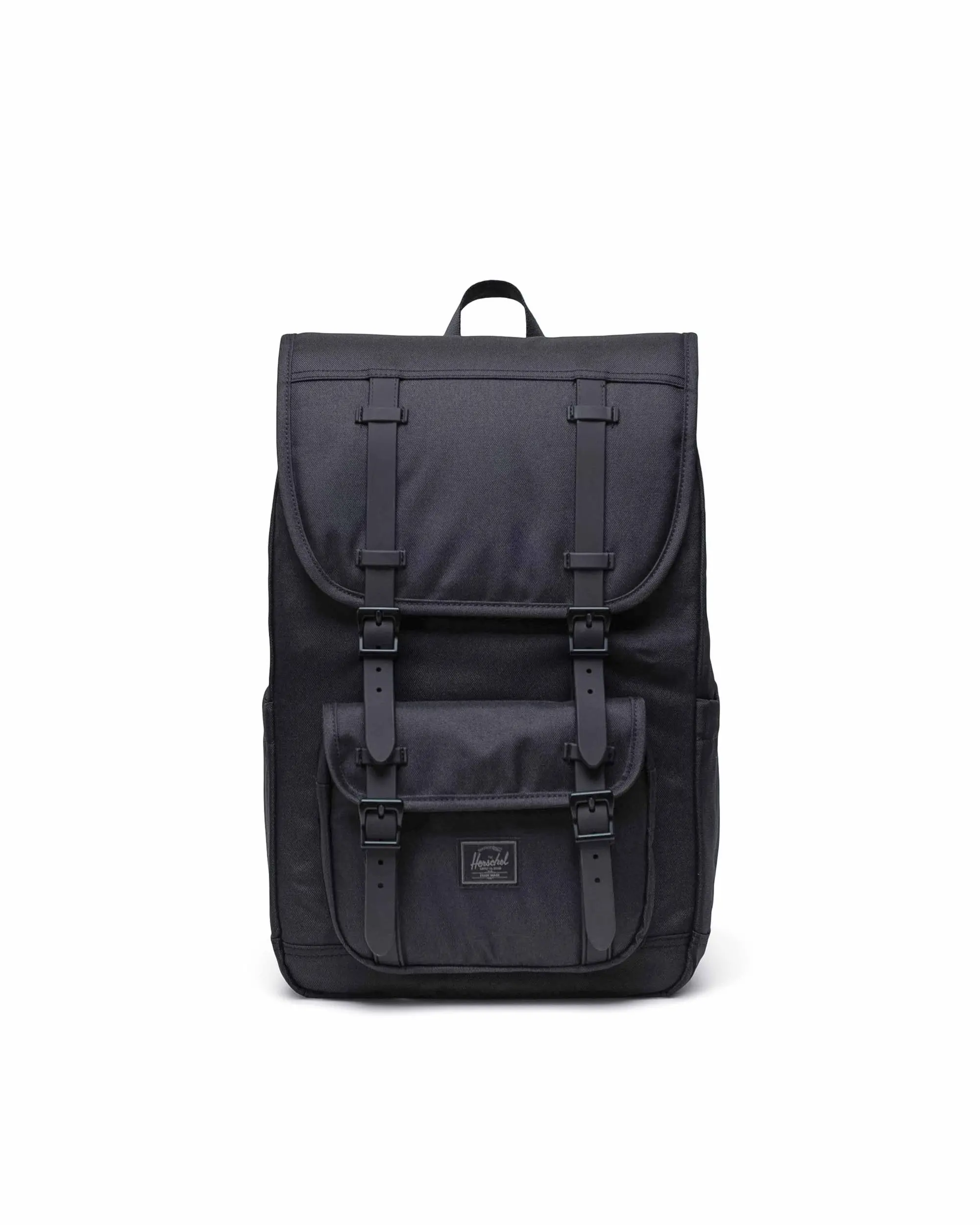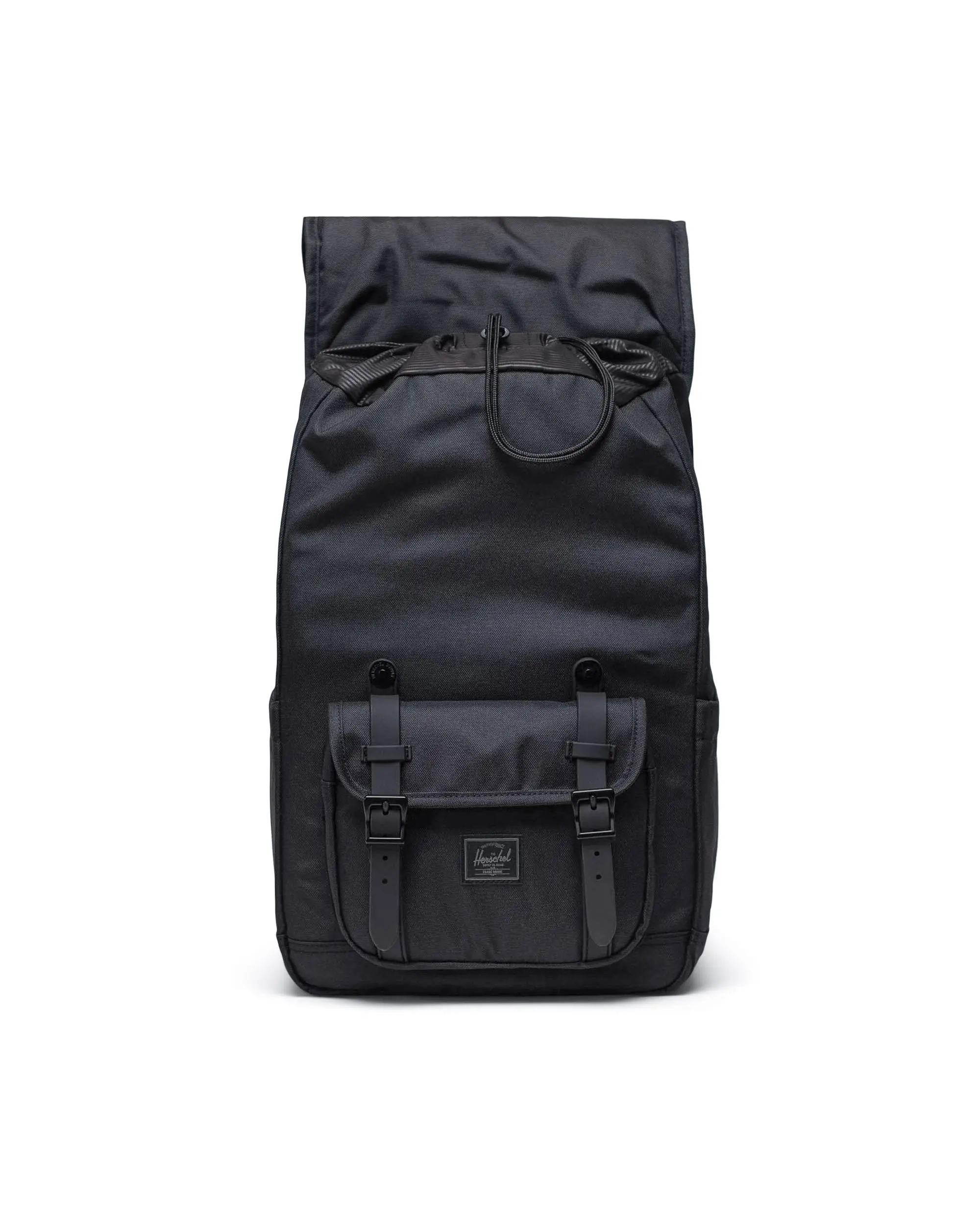 Little America Mid.volyme on kevyt ja selkeä reppu. Edessä on vetoketjulla suljettava tasku, somisteena soljet, sivuilla pullotaskut, takana pysty vetoketjutasku, läppä, magneettinepparit, nyörit, sisällä suoja 16″ laitteelle. Repussa on selkäpehmustus ja topatut hihnat.
