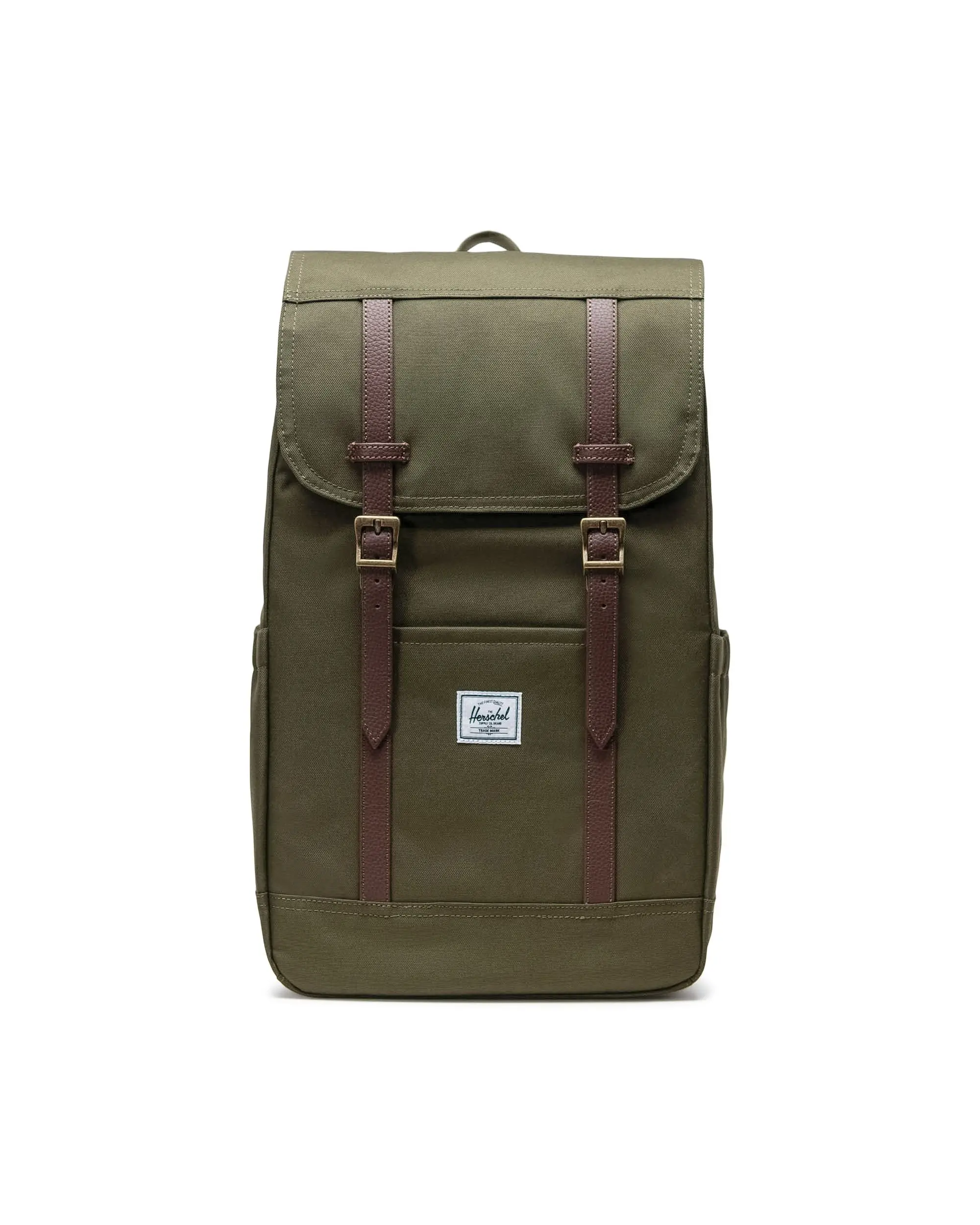 Herschel Retreat on kevyt ja selkeä reppu. Edessä ja sivuilla taskut, takana pysty vetoketjutasku, läppä, mangeettinepparit, ja nyörit, sisällä suoja 15″ laitteelle. Repussa on selkäpehmustus ja topatut hihnat.