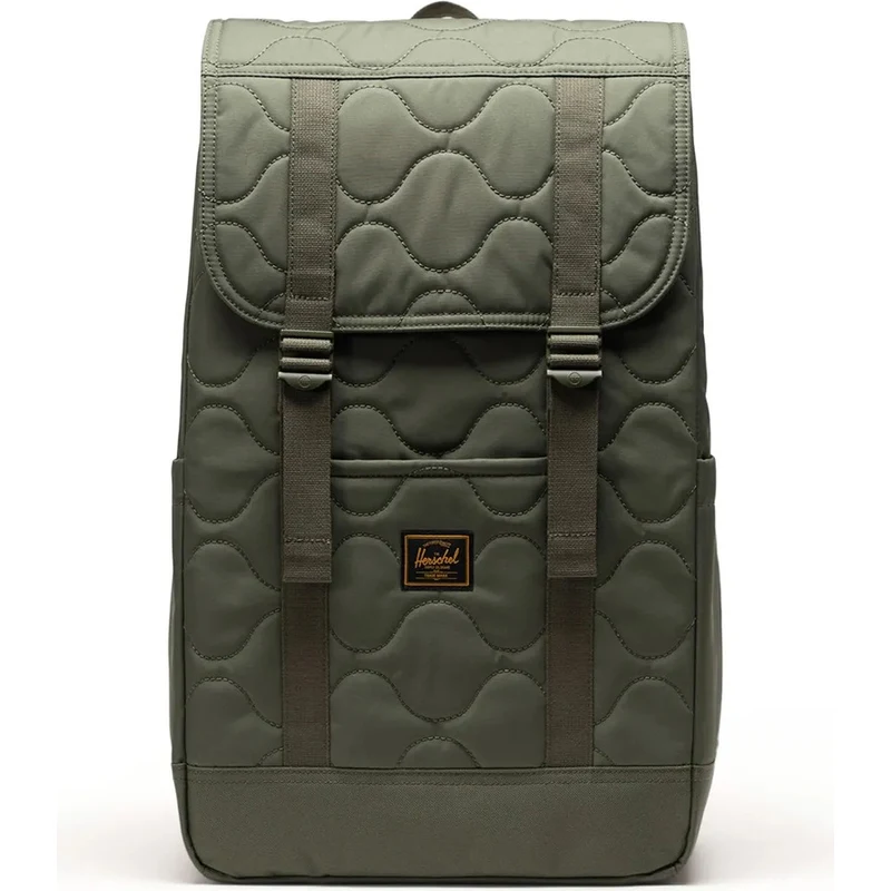 Herschel Retreat on kevyt ja selkeä reppu. Edessä ja sivuilla taskut, takana pysty vetoketjutasku, läppä, magneettinepparit, ja nyörit, sisällä suoja 15″ laitteelle.